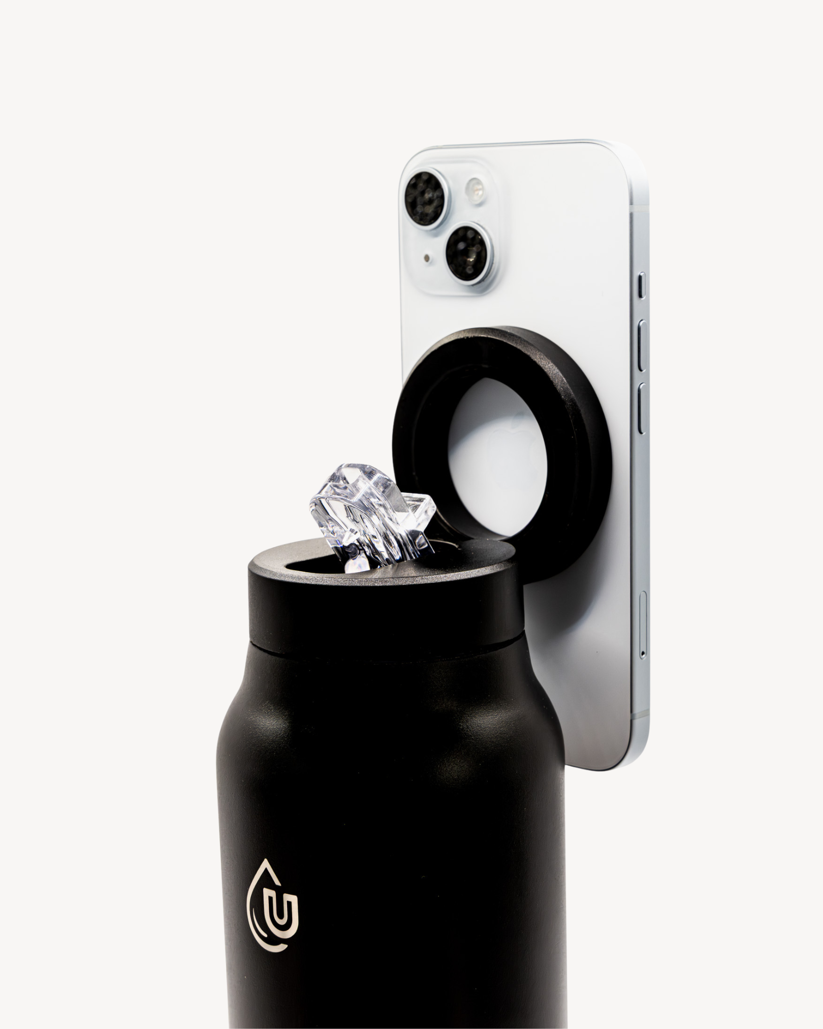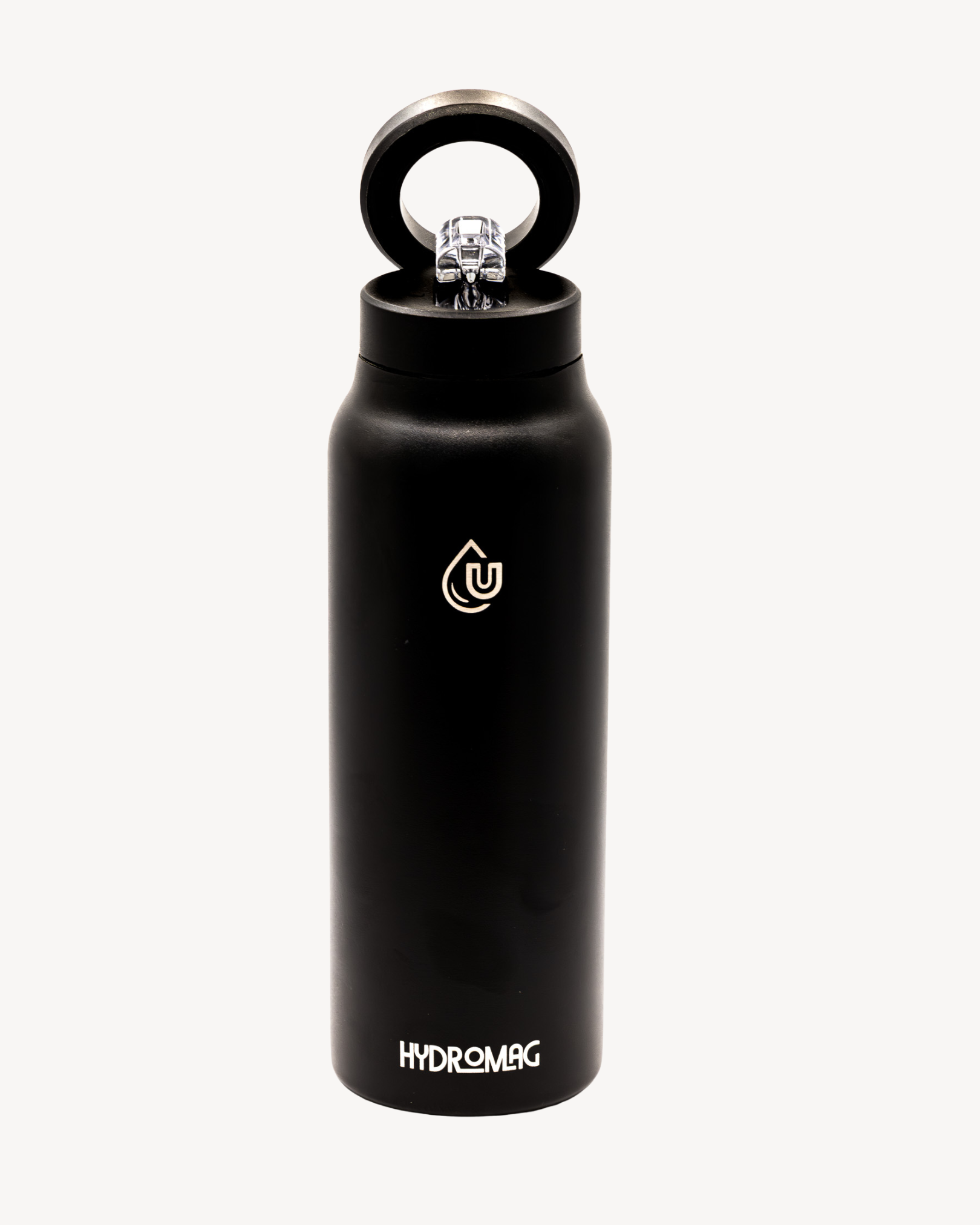 Hydration meets technology with HydroMag the 710ml water bottle featuring a magnetic lid that keeps your phone close and your drink always within reach.